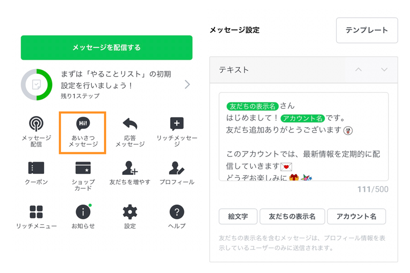 友達追加された直後に送られるあいさつメッセージを作成します。